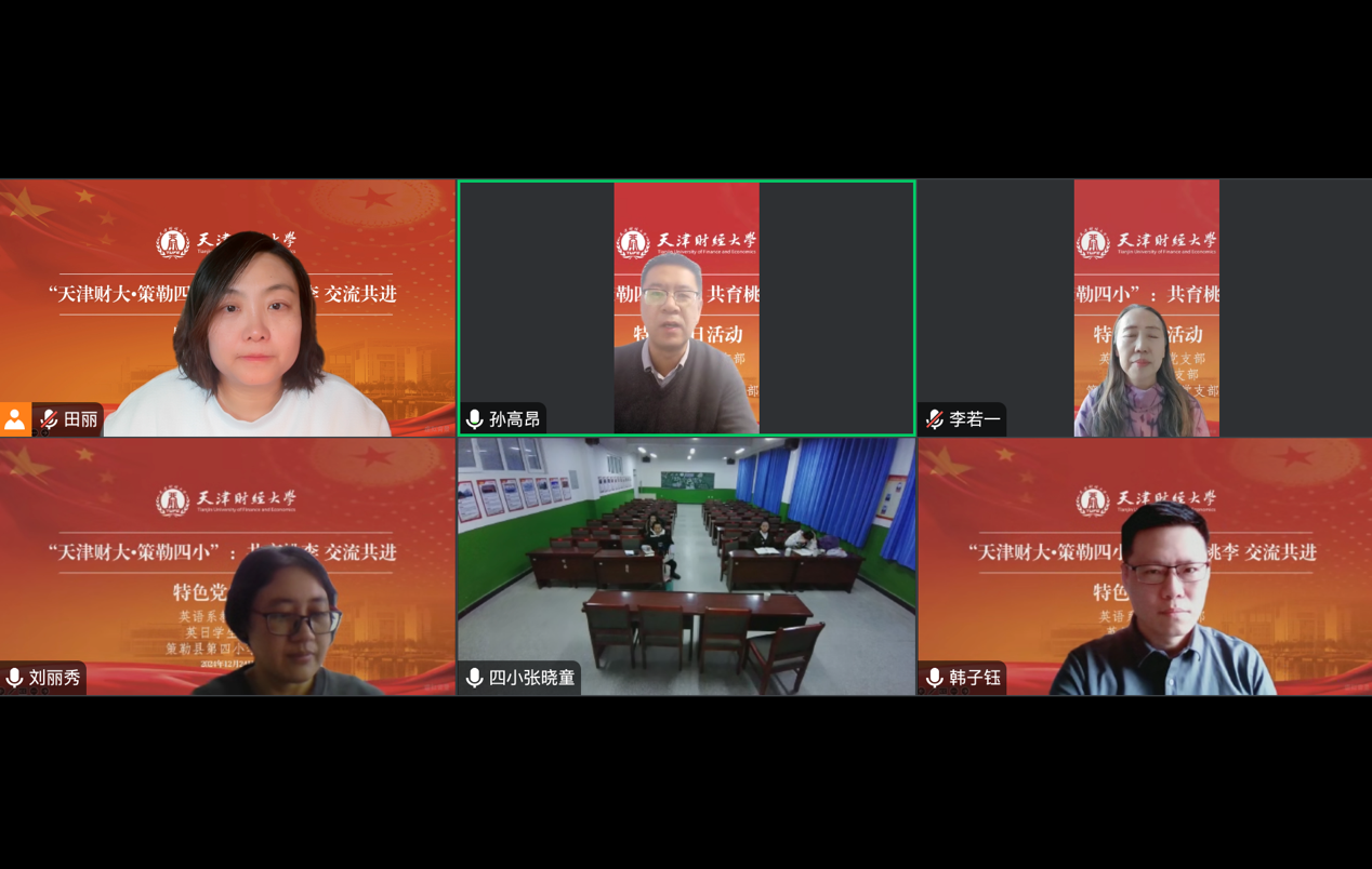 党委副书记孙高昂,英语系教师党支部书记韩子钰、支委宣传委员田丽、组织委员刘丽秀以及英语系优秀党员教师代表李若一教授,携手策勒四小全体英语教师一起于线上共建交流。本次交流旨在搭建东西部跨校外语教学虚拟教研交流平台,提升策勒四小英语教师的业务能力,激发学生对语言学习的兴趣。