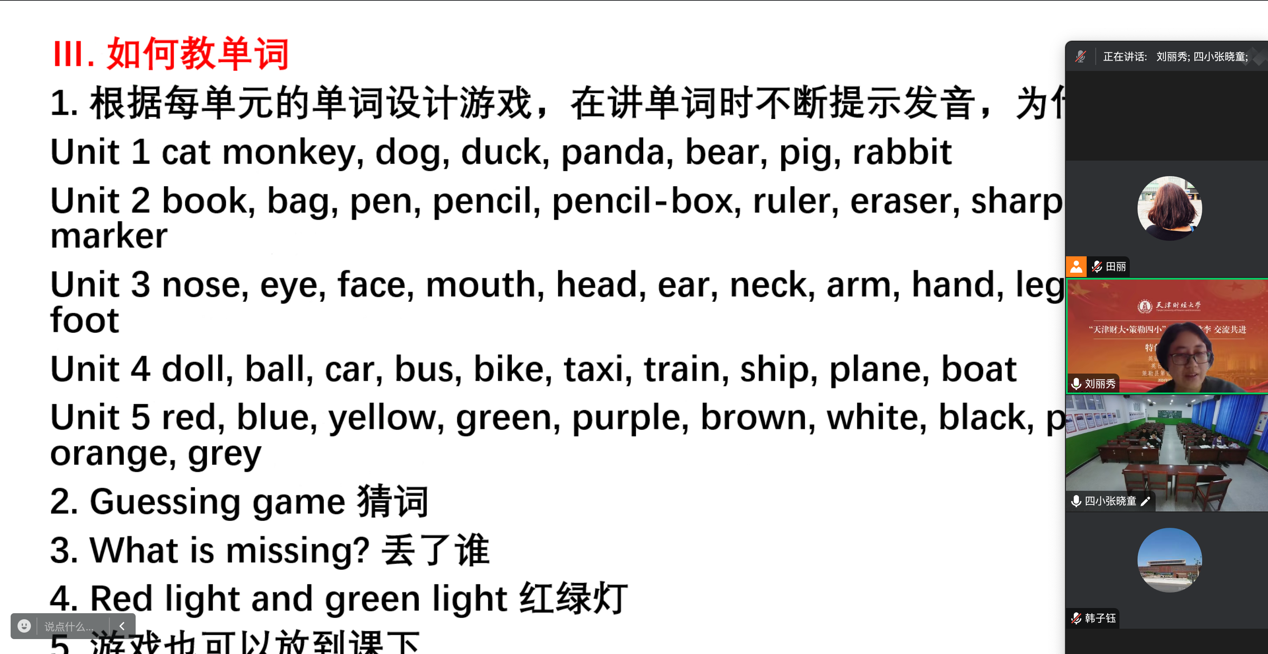 交流过程中,孙高昂书记首先向两校教师致辞,充分肯定了此次活动的意义并希望双方教师加强交流,探索更为丰富教研形式,有效提升教学效果使学生受益;李若一老师分享自己对英语教师专业素养的认知,包括学科知识的素养和教学能力素养,以及如何激发小学生英语的学习兴趣。田丽老师给策勒四小的老师们展示了一个单元的教学流程,希望大家在英语教学中可以从具象的实物出发,使学生明确学习目标,同时注重让先进带动后进,形成良好的英语学习氛围。刘丽秀老师分享了发音、单词、句法和语法的教学方法,希望大家在教学中可以引入竞争机制,并通过课堂游戏的形式丰富教学环节。最后支部书记韩子钰老师分享了关于“虚拟教学共同体建设探索---赋权增能型英语课程资源共享”的认识以及一些成功实践案例,并希望双方能够围绕虚拟教学共同体建设助推建立交流合作新模式。